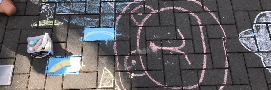 Wir malen mit Kreide auf dem Pflasterweg. Fische und Wasser und ein Boot. Wer war schon mal am Wasser und auch in einem Boot? Da kann es ganz ordentlich wackeln, wenn die Wellen hoch und höher gehen und es vielleicht sogar stürmt.